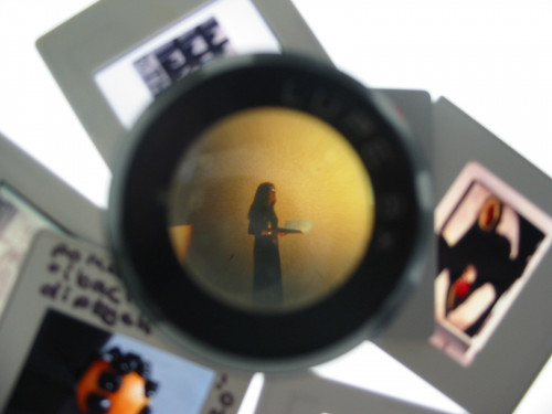 Beeld: Hannah O’Shea tijdens de uitvoering van ‘A Litany for Women Artists’ en diverse dia’s uit de Women’s Art Library, Goldsmiths University, Londen.