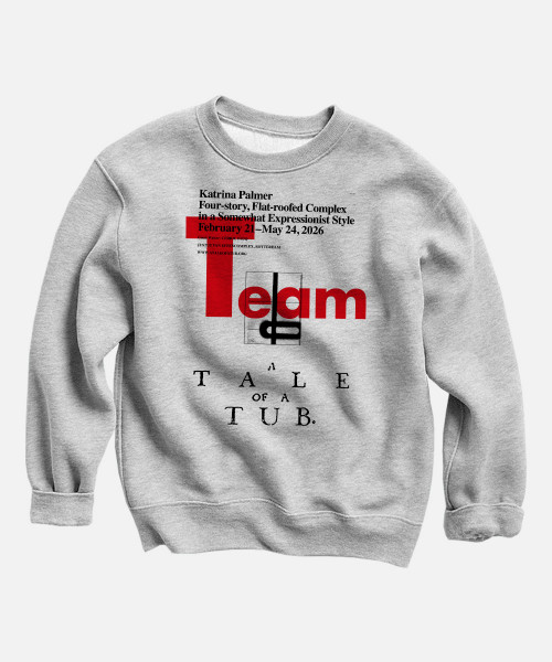 Merchandise is uiteindelijk een manier voor een instelling om financiële steun te genereren en zichzelf te promoten. Door dit van harte te erkennen, introduceren we de ‘Team Tale of A Tub’-sweater. Deels een woordspeling op sportartikelen (geïnspireerd door onze Sparta buren), deels een knipoog naar onze teamleden (die hem dragen als ze dat willen) en deels een verwijzing naar de financiële investering om hem aan te schaffen. ‘Team Tale of A Tub’ is een eenvoudige taalspeling die knipoogt naar de literaire geschiedenis in de naam van de instelling. Dus, ben jij Team Tale of A Tub? Wil je je steun betuigen aan onze activiteiten? Of ben je een fan van ‘The Drain’? Koop dan je limited edition sweater met overdruk, waarbij de poster van elke tentoonstelling over de voorkant van de standaard editie is gedrukt. Er zullen slechts tien van deze editie gedrukt worden voor elke tentoonstelling, dus koop je limited edition sweater voor €40 zolang de voorraad strekt! Ontworpen door Sabo Day (met Francesco Perale).
