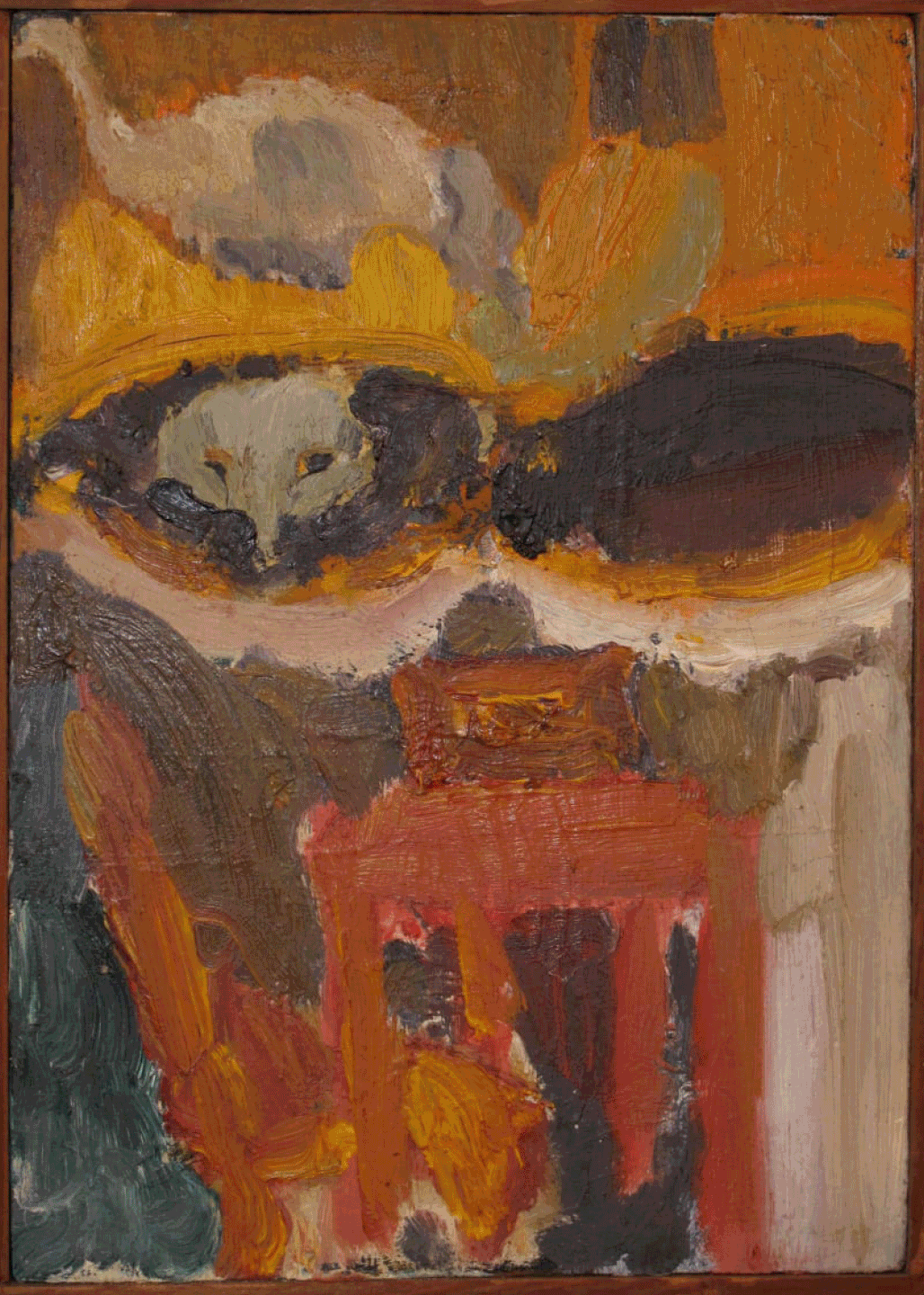 Images: Fran Herndon, File Rats, 1961, oil on canvas, 37.47 x 27.31cm; Marja Bloem and Seth Siegelaub in 1997; Portrait of Emma’s pram surrounded by ‘E’ paintings, made by John Nixon, 1996; Johanna Monk addressing the audience during a performance of the Vanita Monk Orchestra on what would have been Vanita’s 80th birthday, Worm, Rotterdam, 2024.