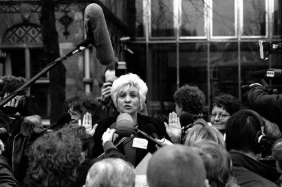Annie Verdoold spreekt in 1997 demonstranten toe in Den Haag, als een van de leiders van het Nationaal Actiecomité Drugsoverlast.